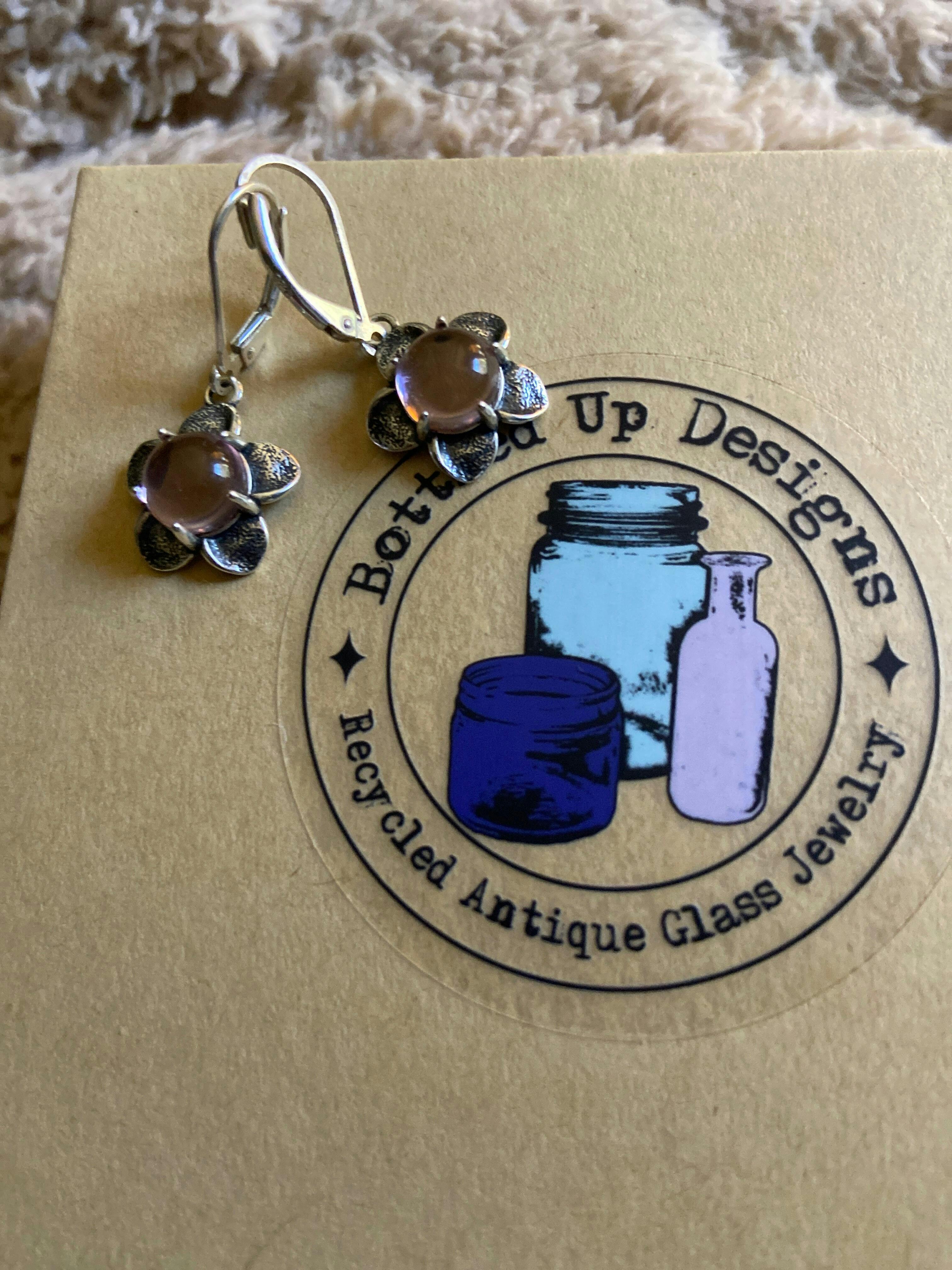Handmade Flower Earrings with Historic Glass: Each earring features an 8mm gem of glowing reclaimed antique glass -- a radiant focal point that captures the light and tells a story all its own. The antique glass is thoughtfully sourced and repurposed, giving new life to materials that are decades -- sometimes over a century -- old.